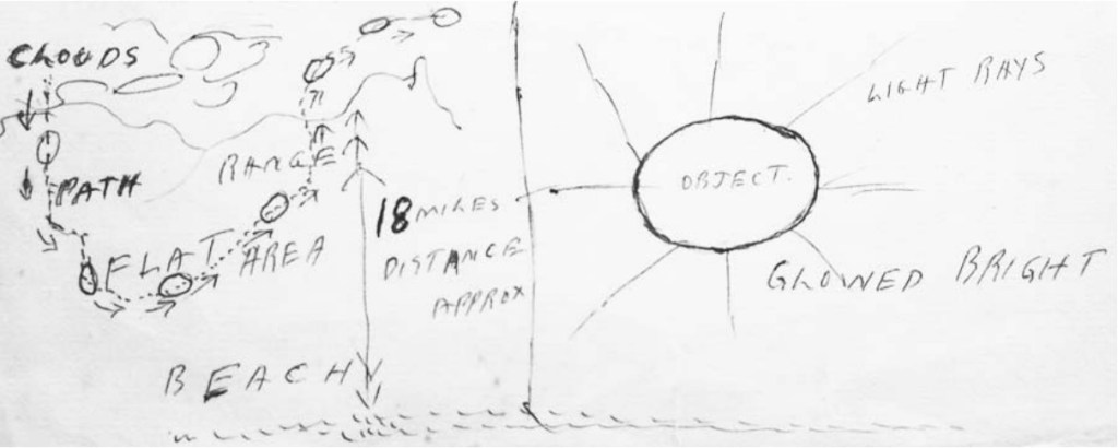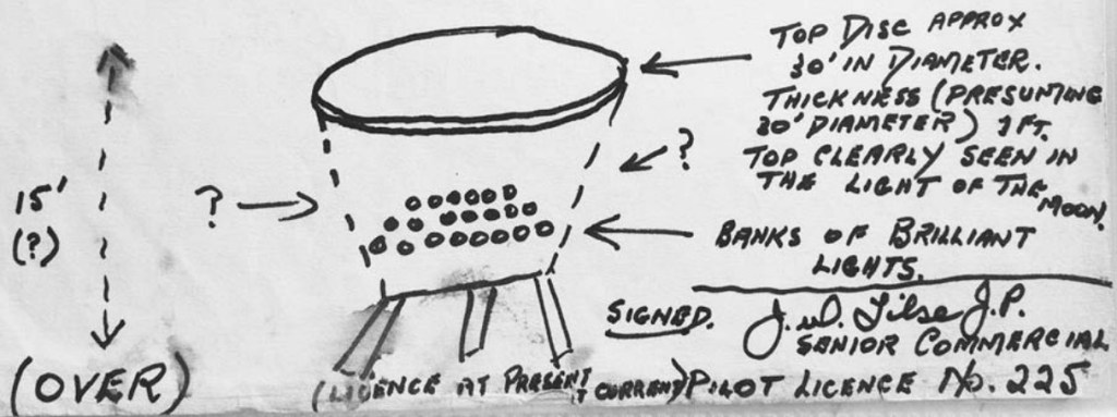 silvery as it approached them. The pair turned a corner in the road, and when they came out of a group of trees they saw the object had landed about 100 yards off the road in a clearing. They were too afraid to stop the car, but described the object as being about 12 feet high by 15 feet wide, spherical in shape but with a flat bottom. It had an open ‘door’ in the front of it, and a ramp leading from the door to the ground.