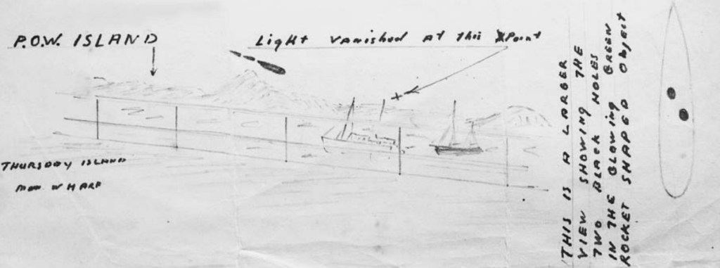 I was sitting on my veranda looking out over Cleveland Bay when I noticed a cigar-shaped object pass from west to east over the Bay and directly towards Magnetic Island. The nose of the object was of a very brilliant yellow, while the rest of the body was bright orange. The nose appeared to be the size of a golf ball when held at arm’s length. The speed was approximately the same as a meteor or Sabre jet flying at 10,000 feet, but there was no noise. The object was sighted at 10.54pm and lasted for 8-9 seconds. The object passed beneath the moon and disappeared over Cape Cleveland behind a small group of clouds.