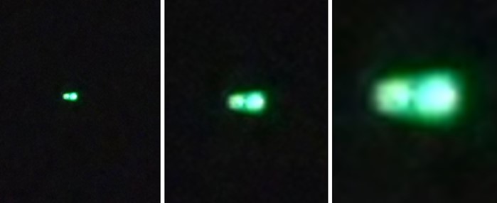 I have attached a sketch of the location and the movements the object undertook – it executed a perfectly linear half-rectangle in its movements. I have also attached the single good image I obtained at 9:04pm. Close up the object appears to be two green orbs – 1 small and 1 large – connected by a green ‘rod’. Up close it is far more interesting than I expected! I estimate it was visible for 10 minutes or more all told, and there is no knowing how long it had been in the area for before I started paying attention to it. If it was hovering out at sea I would imagine people living along the bayside would have had a very good view of it for quite some distance along the coast, as would the staff in the airport control tower, not to mention the pilots of the approaching aircraft. Also, given how many people must have been out looking at the lunar eclipse, I can’t imagine that nobody else saw it. There was literally no missing it!