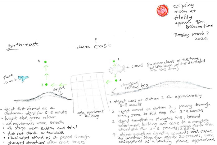 Coorparoo (Brisbane), Qld. March 3 2026, 9.00pm Witness Report: During observation of the lunar eclipse of March 3 2026, a green, orb-shaped UFO was observed hovering east of Coorparoo/Brisbane at 9.00pm. The object was hovering in the direction of the Cleveland/Redland bay area, and was possibly over Moreton bay or even further out to sea. The object was as bright as Saturn or Jupiter, if not brighter. It was stationary for some time prior to my attempt to take a photo of it, as initially I thought it to be a helicopter and not worth looking at.
