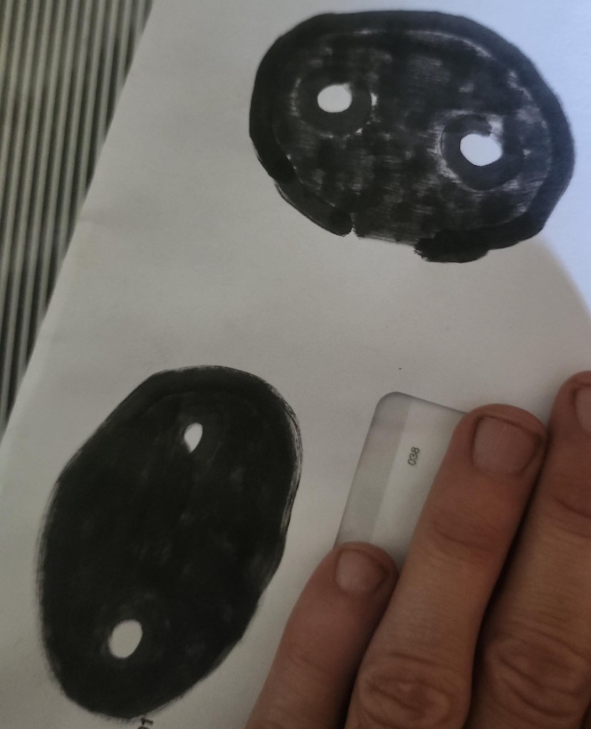 Above: witness sketch of large head with round eyes