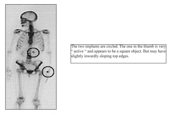 X-rays revealed that X had an implant in her left thumb in the upper joint where it joins the hand. This was still painful when pressed after many years. A second implant showed up in the pancreas. A third implant and the most interesting was revealed to be in the pituitary gland cavity in the centre of her skull. This implant looked like a small rectangular “bottle” with a short neck.