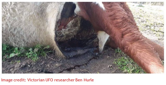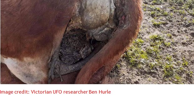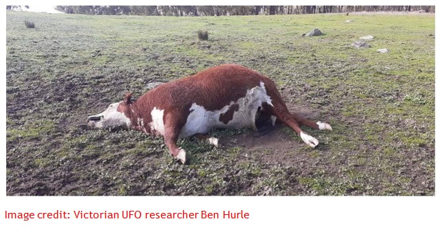 In 2021, Victorian UFO researcher, Ben Hurle, received a report from a doctor who was walking on his neighbour’s property when he saw a cow lying on the ground. The animal was dead and had been cut around the mouth and the rear with something very sharp. The animal was discovered on a hill in an isolated location, with no animal or human tracks observed around or near it or any scuff marks caused the mutilated animal itself. The doctor who made the gruesome discovery thought the animal had been dead for about one week. When the doctor spoke to his neighbor, the neighbor said another cow had died on the property in a similar way. (6)
