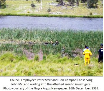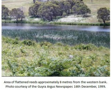 Within hours of the original report by the Filtration Plant Manager, Peter Starr, of an unusual pattern in the reeds on the edge of Guyra No.1 Dam, Guyra was swarming with RAAF and Army personnel, police investigators, officials from the Environment Protection Authority, and hazardous materials experts from state and federal agencies. Television and radio crews poured into the town along with jostling crowds of sightseers who were proving difficult to control. Divers with powerful lights plunged into the reservoir to take water samples, while police divers searched for the object itself, which had left a 20 metre long and 40 centimetre wide tunnel before lodging itself 4 metres deep within the soft bedrock. The object was irretrievable and eventually deemed almost certainly to be a meteorite. However, Dr Ron Barnett and John Auchettl of Phenomena Research Australia visited the site and reported that the angle of the object’s entry into the dam had been very shallow, about 45 degrees. John found no-one in Guyra who could recall hearing an explosion or sonic boom, and the surface of the reeds had burn marks which were unusual for a meteorite impact. In addition, Guyra had experienced two power blackouts around the same time.