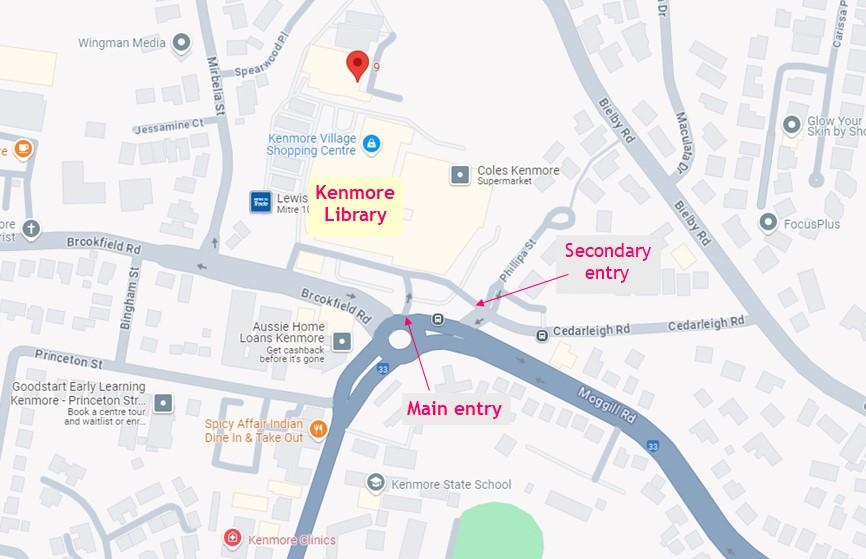 In person public meetings are held on Saturday at the Kenmore Library located in the Kenmore Village Shopping Centre, 9 Brookfield Road, Kenmore, Brisbane from 11am to 3pm. (see map below) These meetings are open to members and the general public. The main entry to the shopping centre is from the Moggill Road and Brookfield Road intersection at the roundabout.